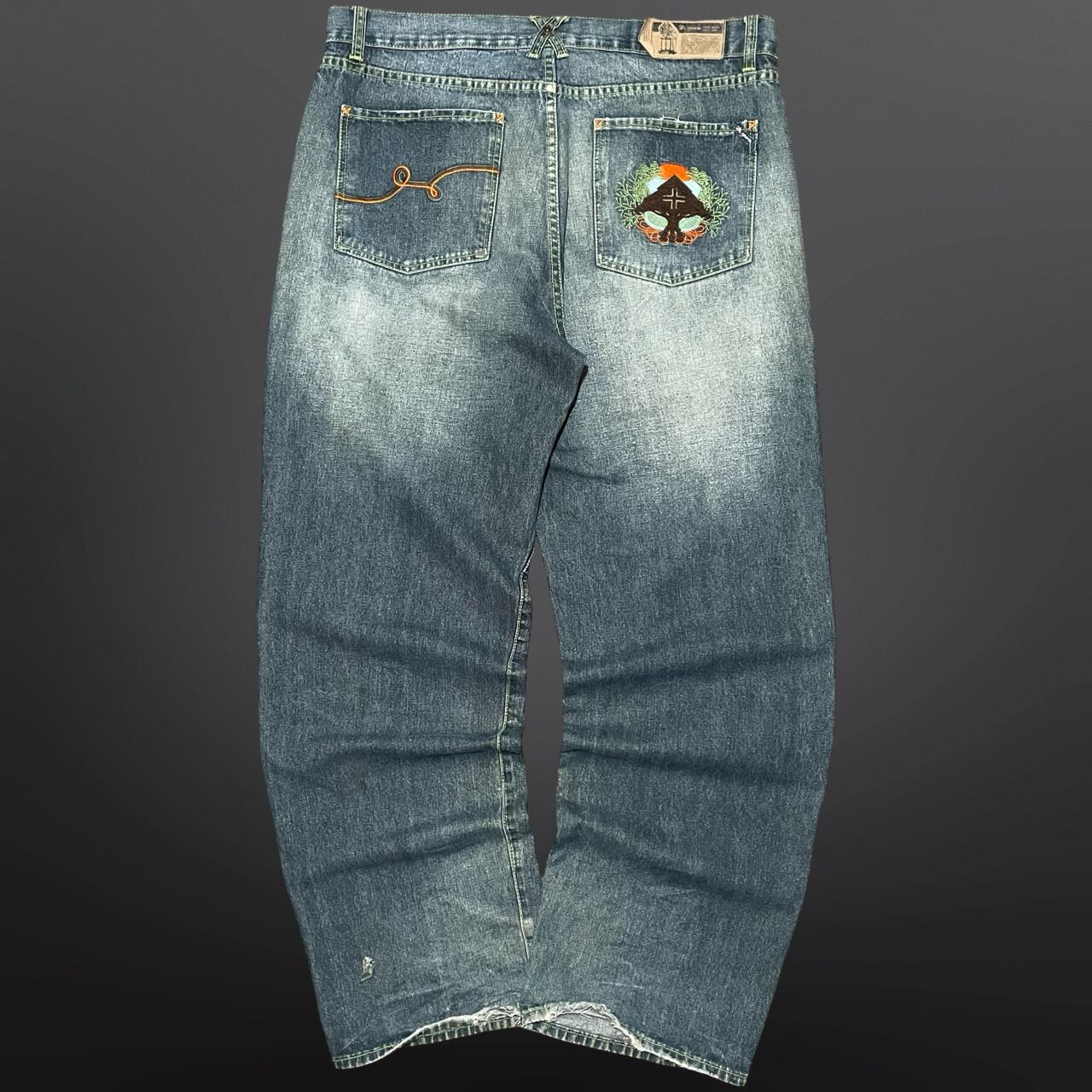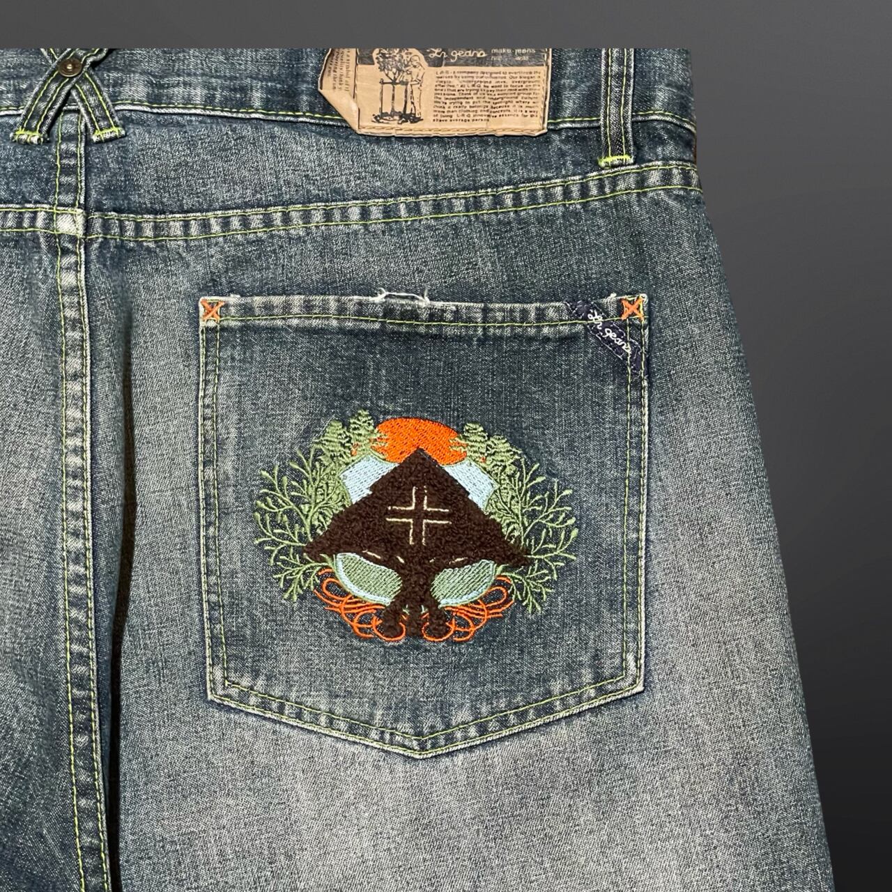 バックポケットにはブランドの象徴的なツリーロゴ刺繍が施されており、