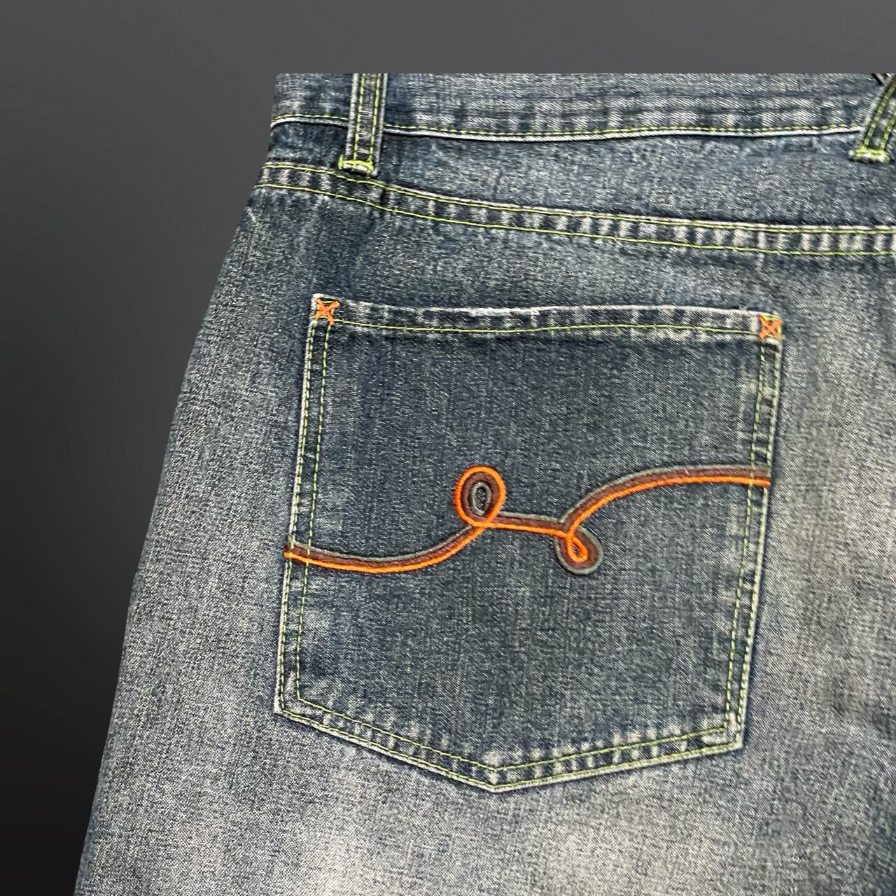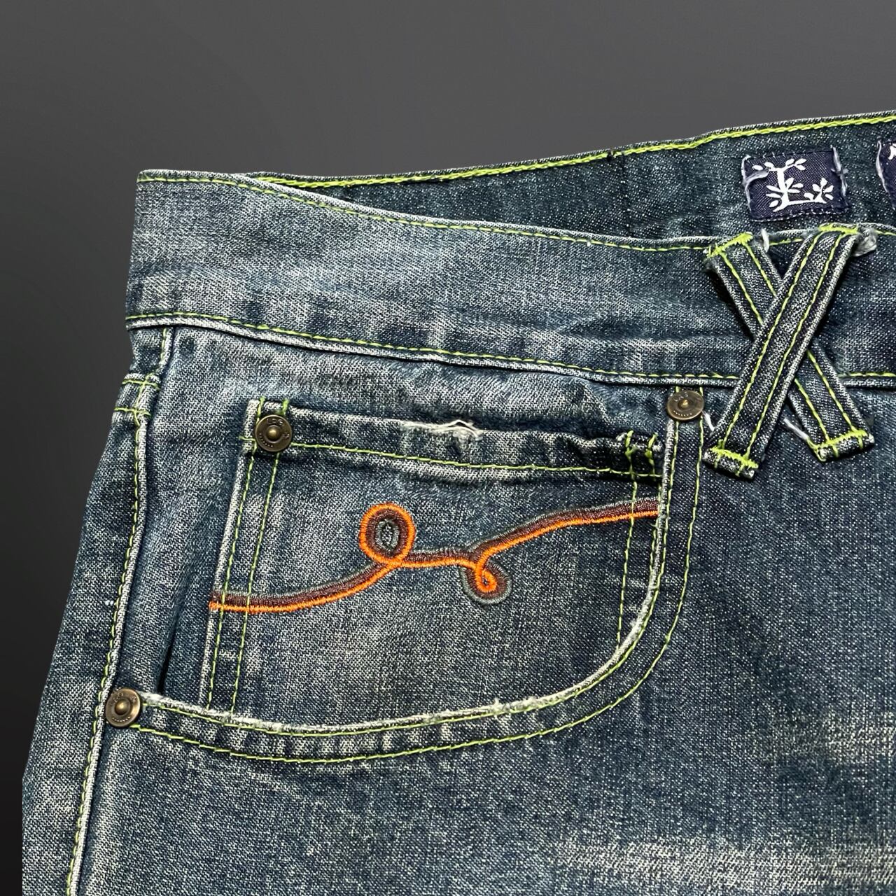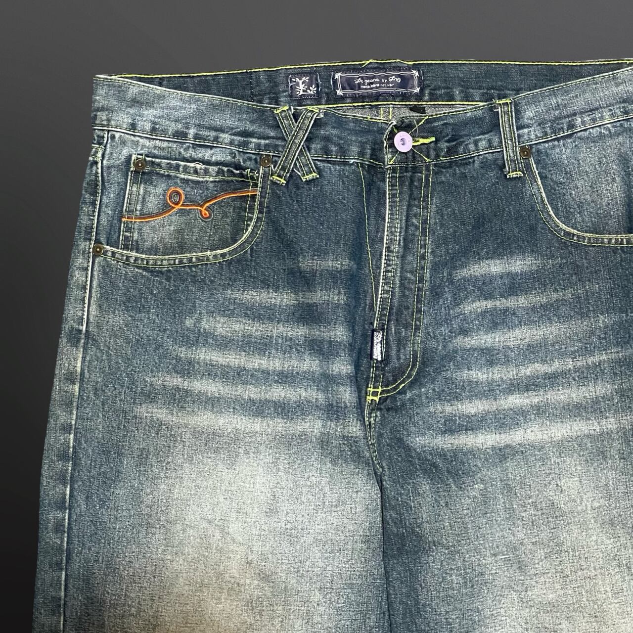 ライトな色落ち加工とネオンイエローのステッチがアクセントになった、