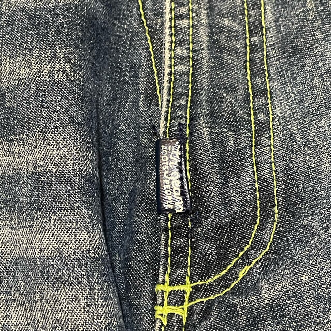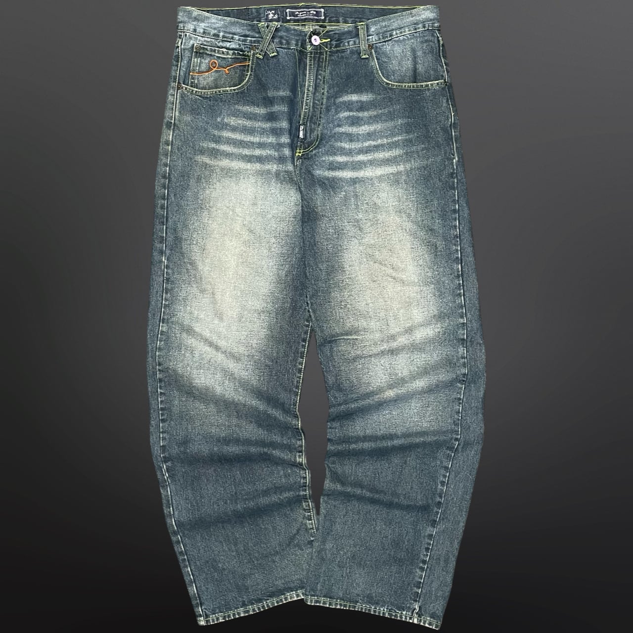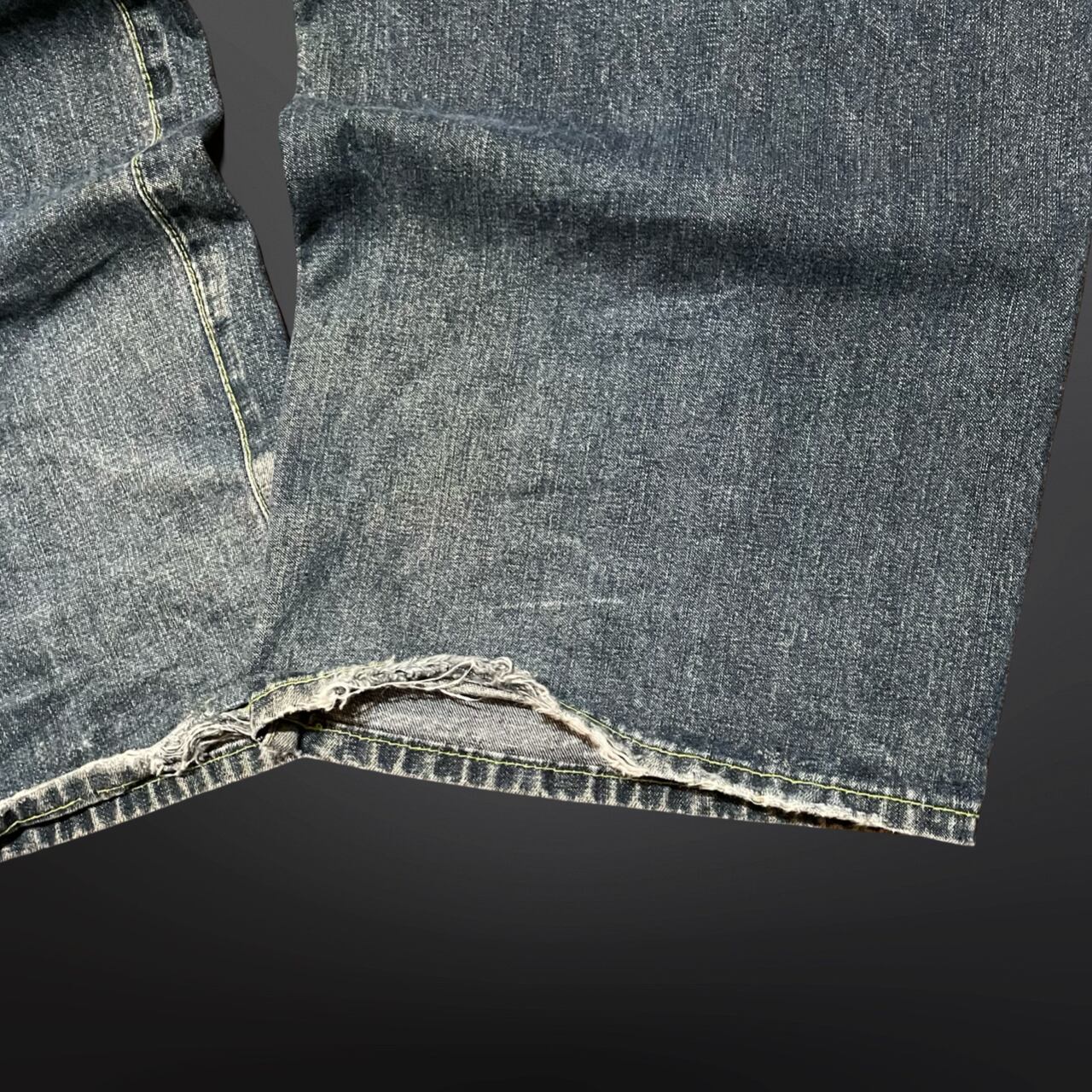 ライトな色落ち加工とネオンイエローのステッチがアクセントになった、