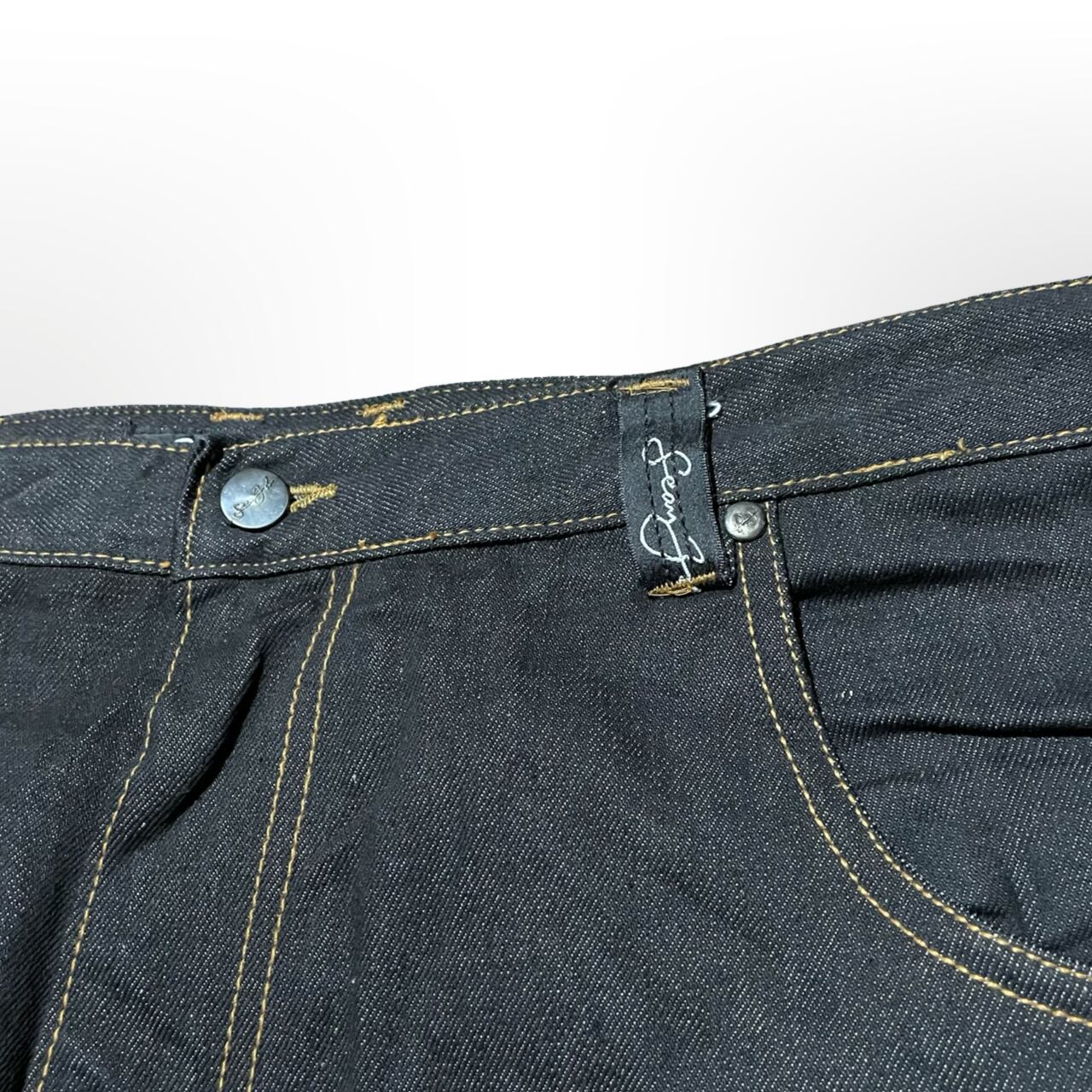 しっかりとしたリジッドデニム生地に、ブランドロゴ刺繍が随所に施された一本。