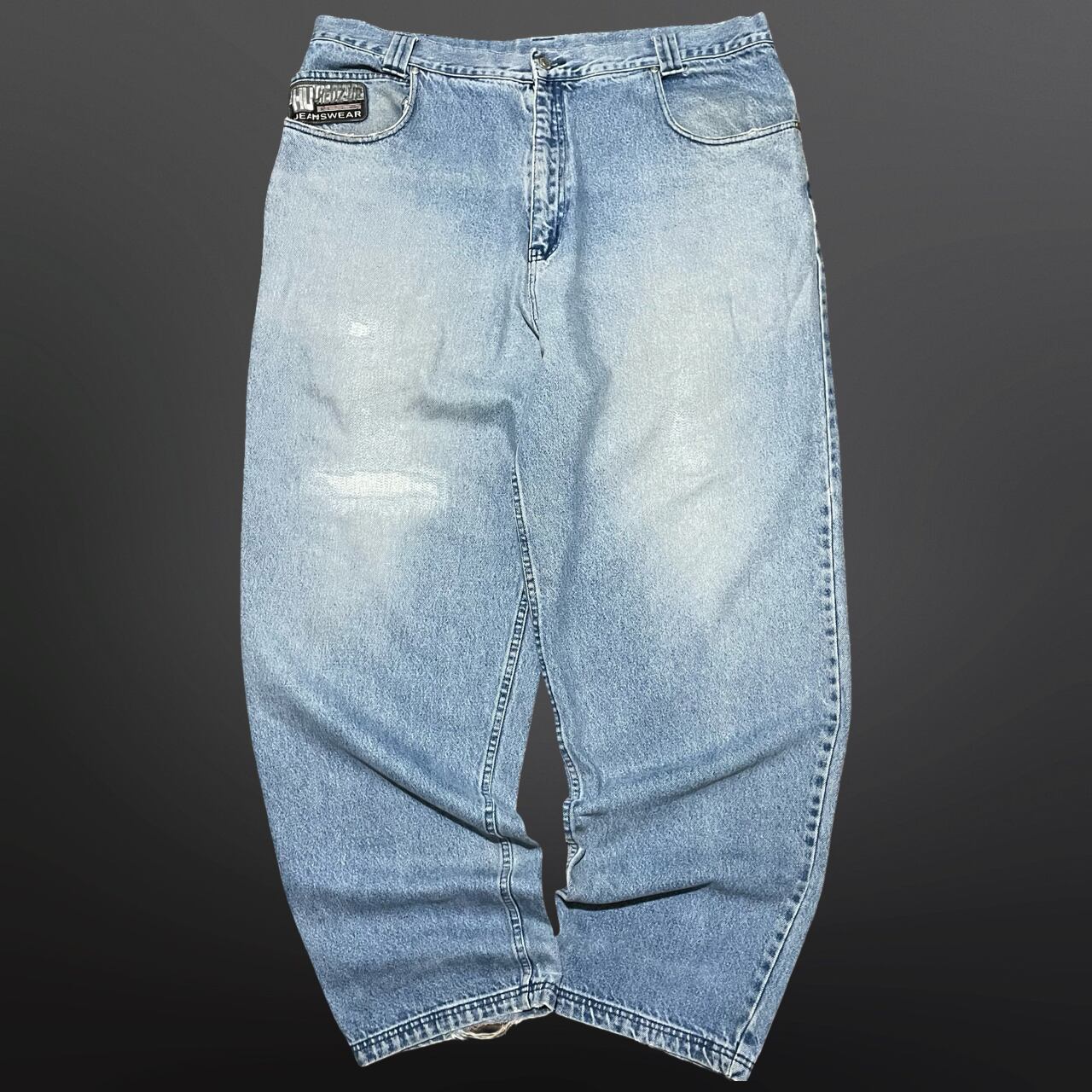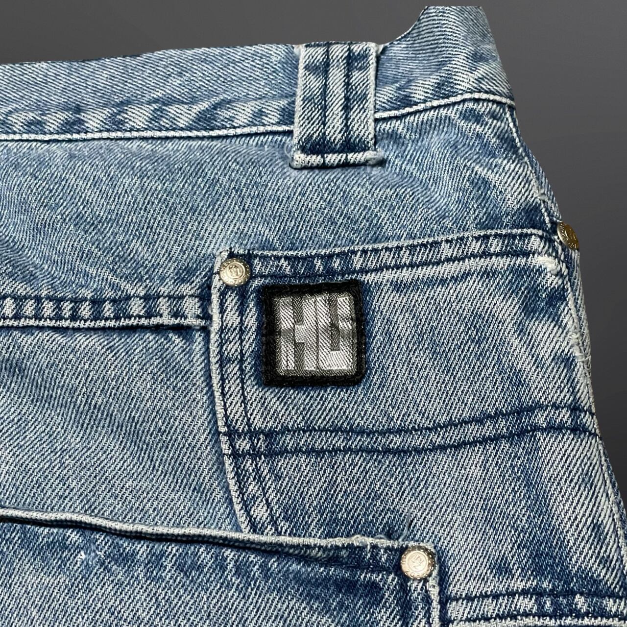 ライトブルーの絶妙な色落ちにフロント・バックのロゴワッペンが映える、当時らしい存在感の1本。