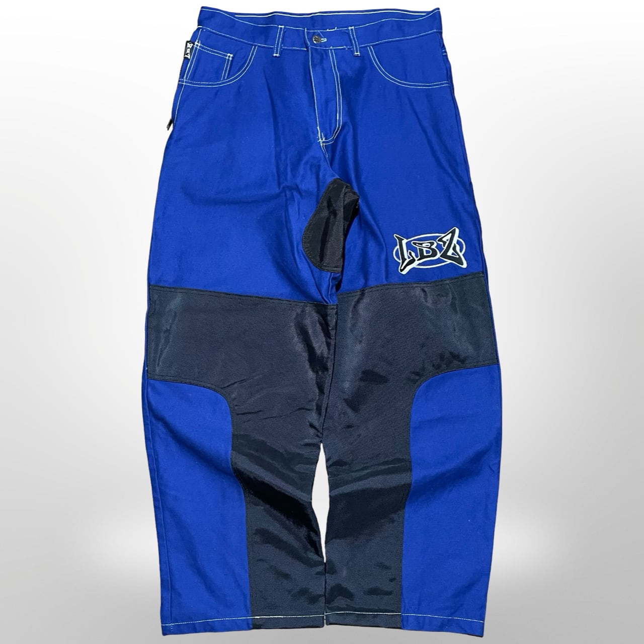 ブルー×ブラックの切り替えデザインに、LBZロゴ刺繍、ZIP付きポケットなど、存在感抜群のバイカーパンツです。