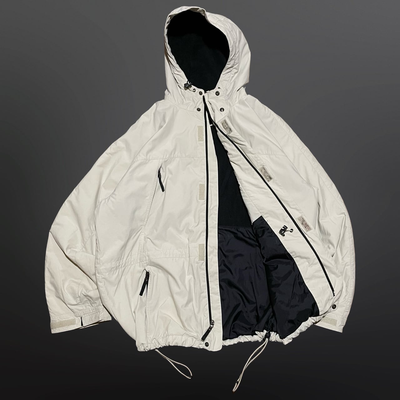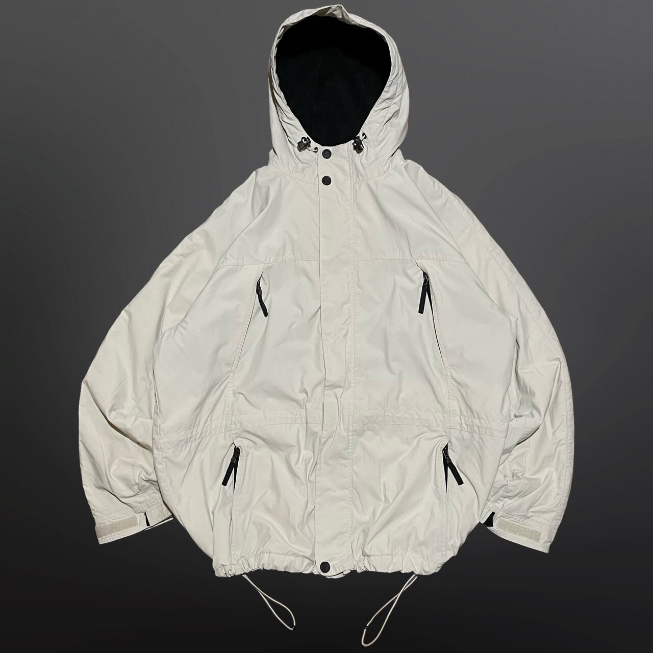 中綿入りで防寒性もあり、裾はドローコード付きで