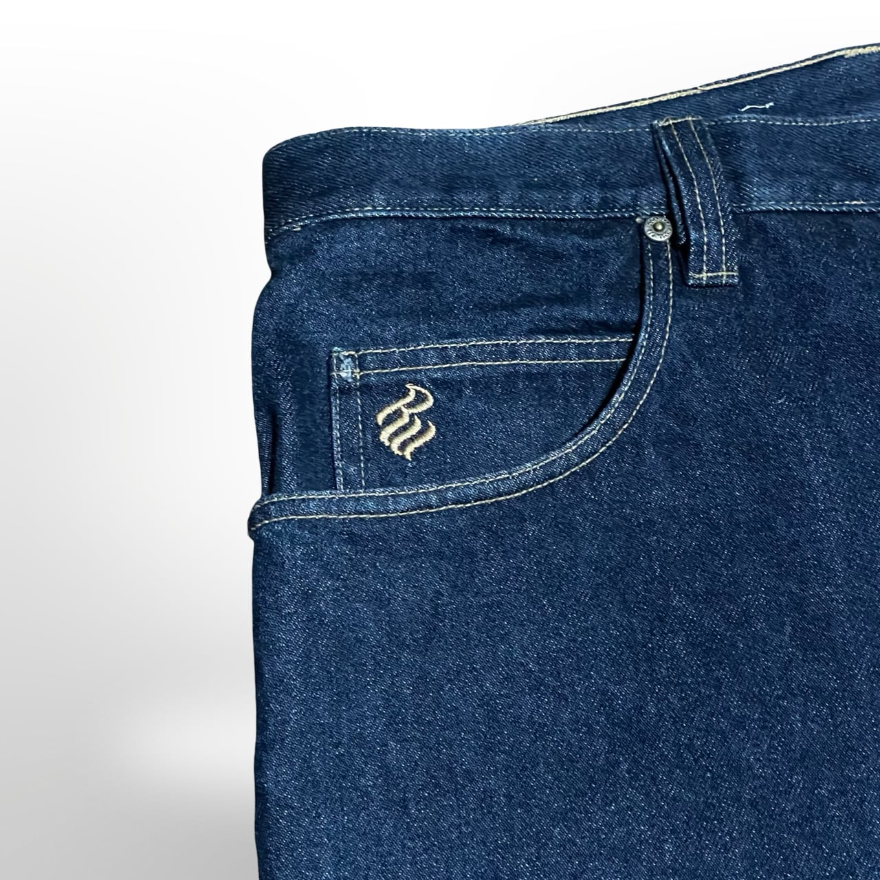 深みのあるインディゴに、バックポケットの刺繍ロゴが映える